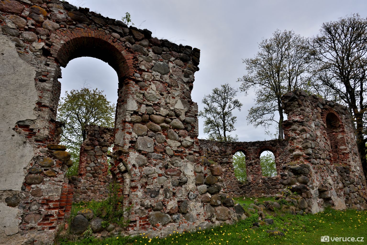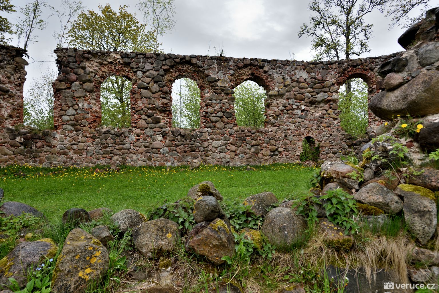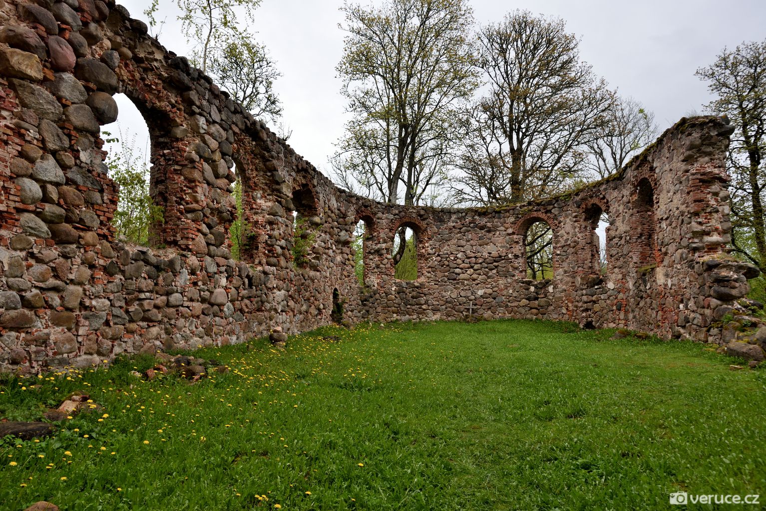 Zříceninu hradu Embūte (německy Amboten) jsme měli vyhlídnutou dopředu. Kamenný hrad nechal v druhé polovině 13. století postavit Konrád von Mandern, mistr Livonského řádu (autonomní větve Řádu německých rytířů), coby obranou pevnost proti nájezdům z Litvy. Předtím stálo o půl kilometru dál dřevěné hradiště. Od 16. století hrad postupně chátral a materiál stavby byl použit nejprve na stavbu panského domu a později na místní kolchoz.