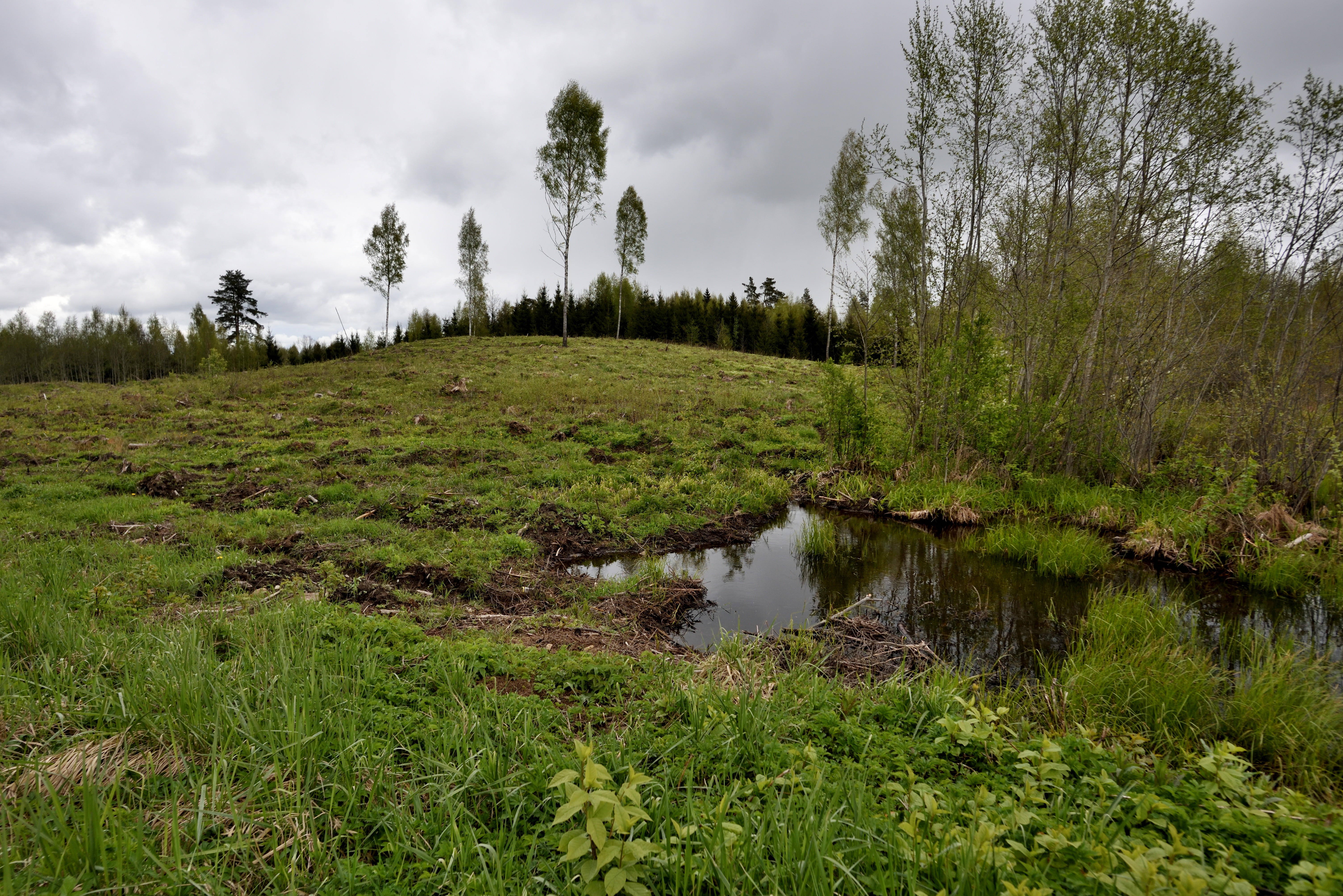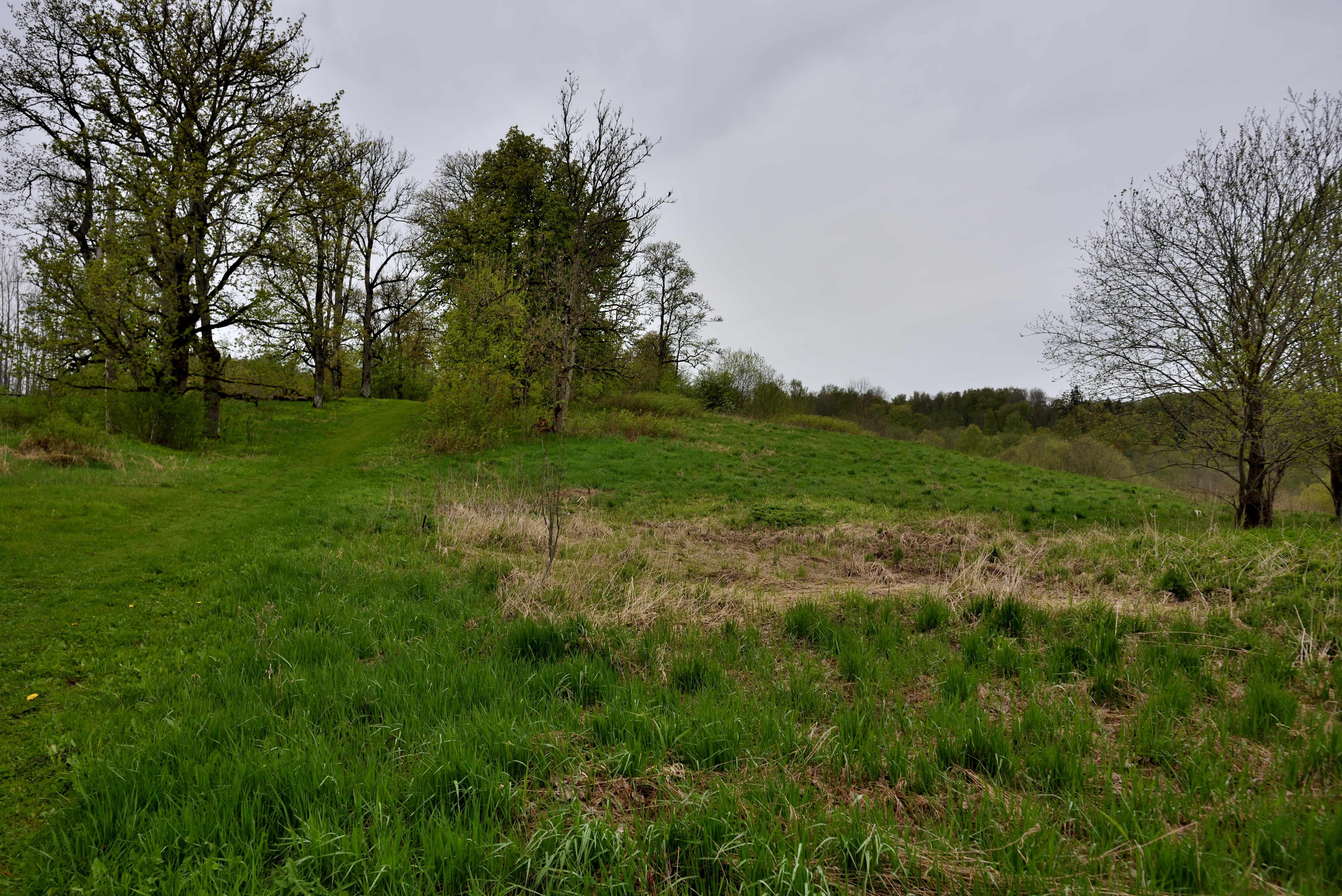 Hradiště, které chránilo oblast před postavením kamenného hradu, jsme jeli navštivit také. Kdyby nelilo jako z konve, prošli bychom si celý okruh pěšky, takto jsme byli rádi, že na zříceninách jen kapalo, cestou na hradiště se ale spustil pořádný slejvák. Fotku odtamtud tak máme jen jednu, pro úplnost ji ale přidám i tak. Hradiště založili Kuršové a předpokládá se, že se jednalo i o posvátné/obětní místo.