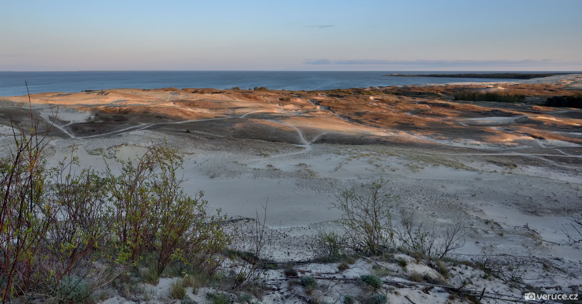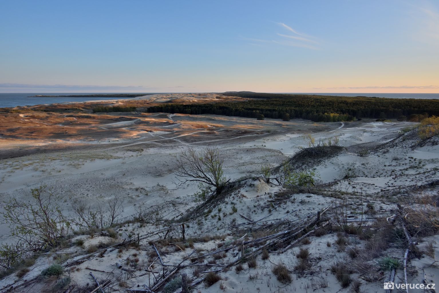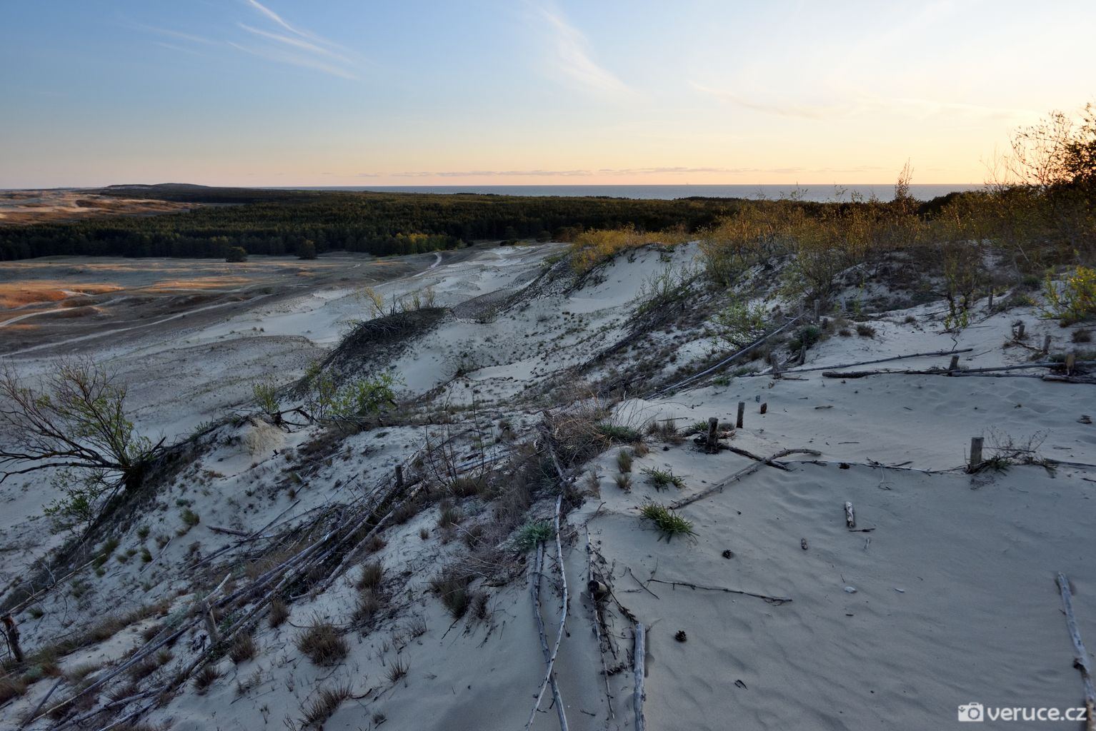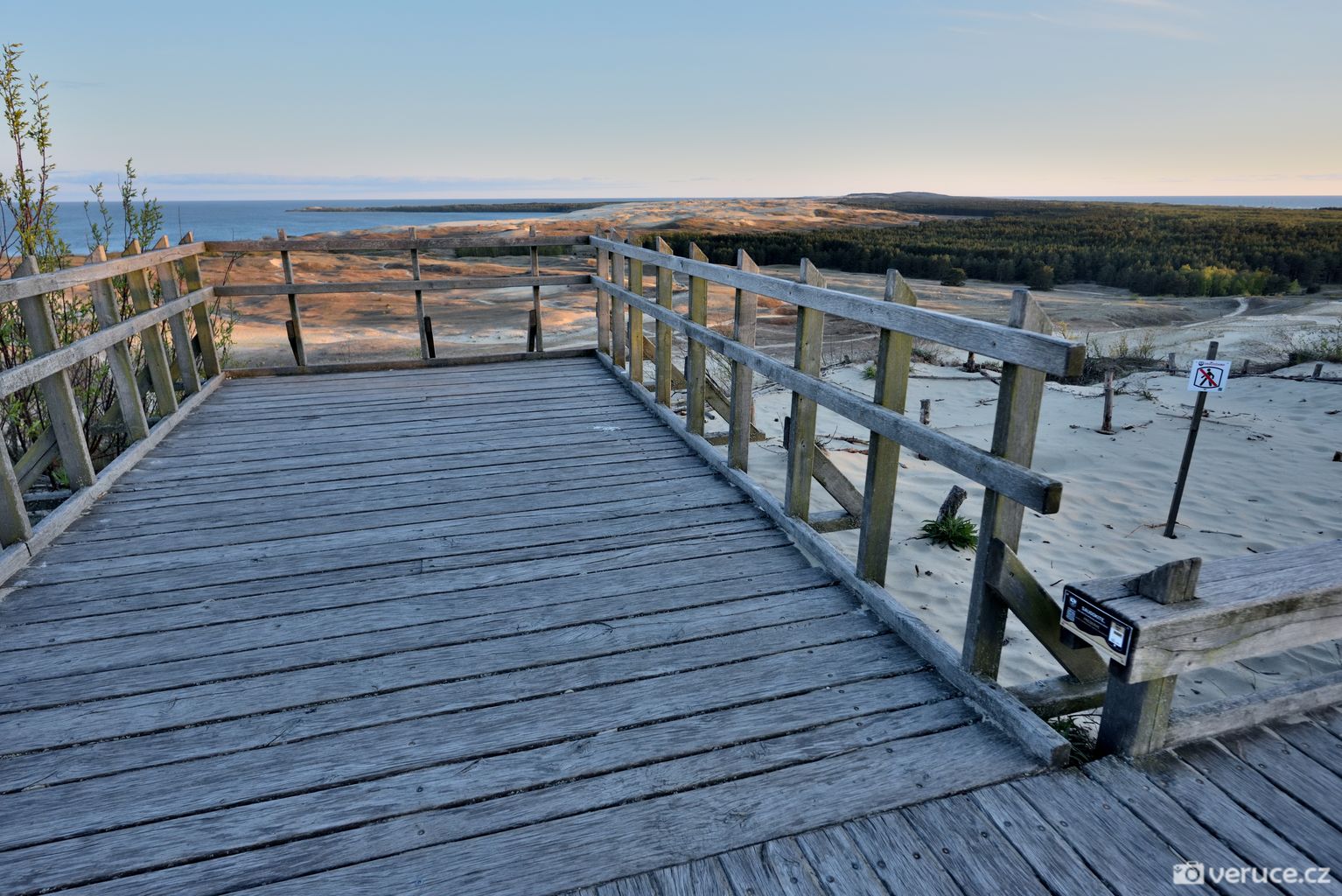 Na některé části duny se nesmí vstupovat, aby se neuspíšily erozní procesy. Naučná stezka z Nidy je proto vedena z části po dřevěných chodnících. Její součástí jsou také vyhlídkové plošiny. A že je rozhodně na co se dívat. Z nejvyššího bodu je k vidění Baltské moře i Kurský záliv najednou (Kurská kosa tady má na šířku dva kilometry). Mezi nimi se nachází hromady bílého písku bohatého na křemen a dál za nimi zase lesy. Z duny to dá sotva dva kilometry k hranicím s Kaliningradskou oblastí (ten výčnělek vlevo, který je vidět na fotkách z vrcholu duny, se nachází už tam).