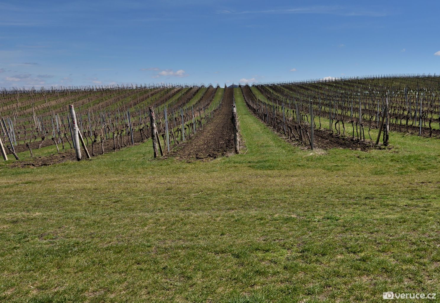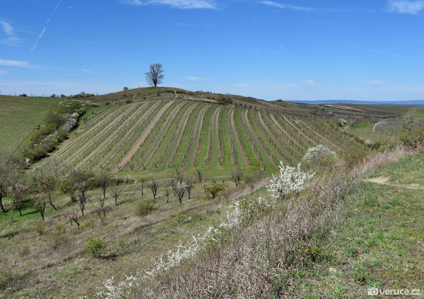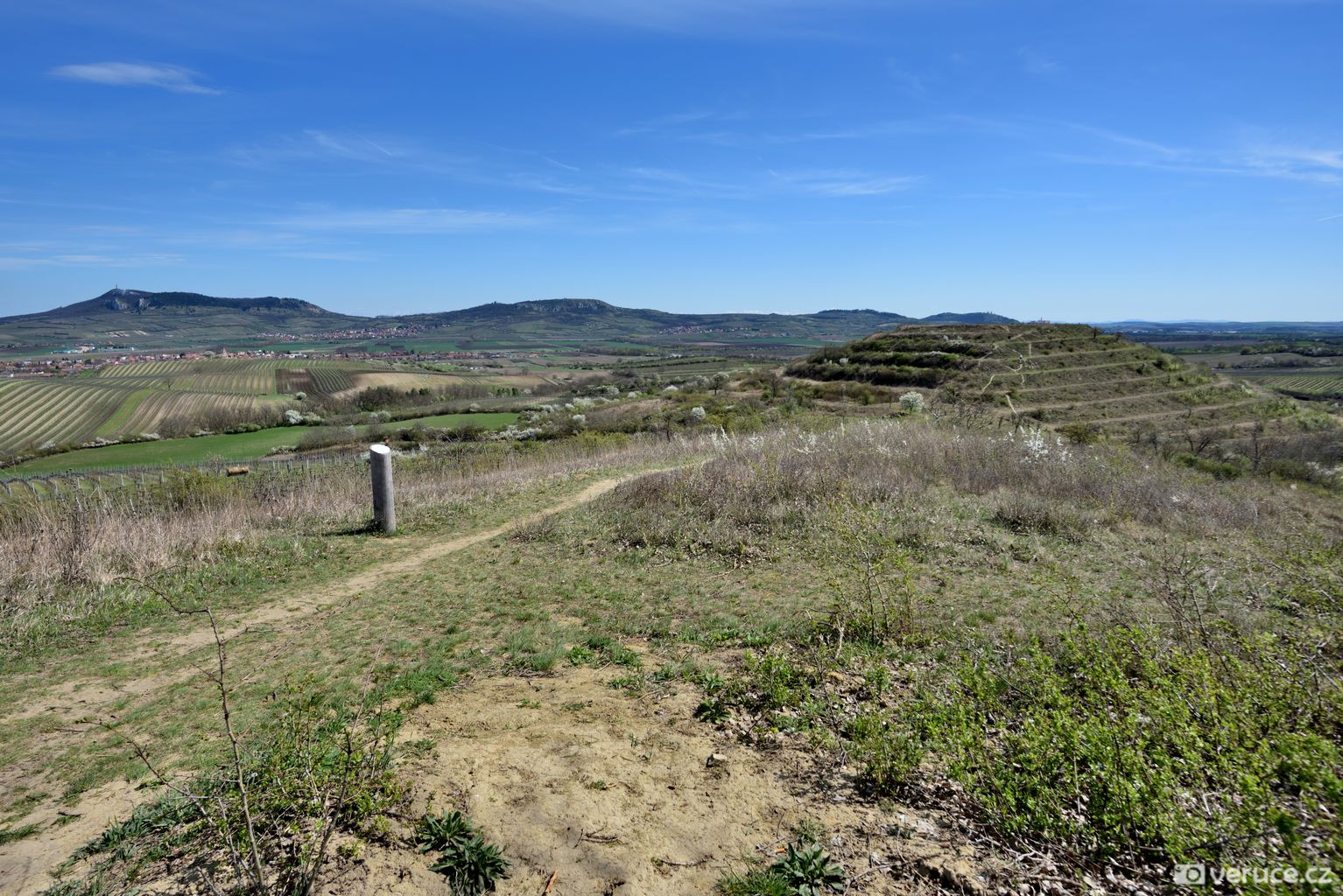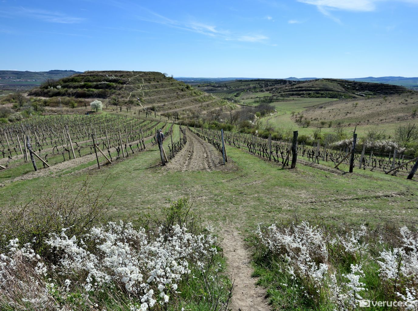 Jistě vás, stejně jako mě, zajímá, kde se mezi vinicemi v mírně zvlněné krajině vzal ten nápadný terasovitý kopec, k němuž jsme z Růžové hory následně zamířili. Rozluštění této záhady je poměrně snadné, protože se o žadnou záhadu nejedná. Velká Slunečná není žádná stupňovitá pyramida, byť ji trochu připomíná, ale obyčejný vrch, na němž byla v 60. letech minulého století provedena terasovitá úprava coby příprava pro budoucí vinici. Důvod k tomuto kroku byl prostý – prudké svahy se špatně obhospodařovávaly. Na zasetí vinné révy už ale nedošlo.