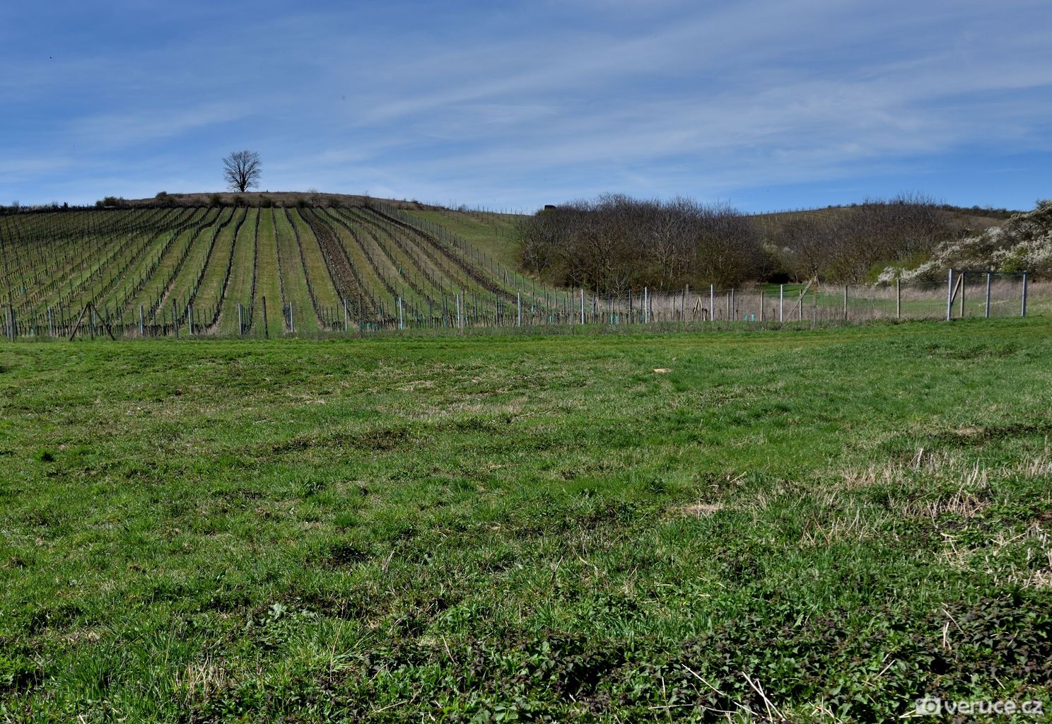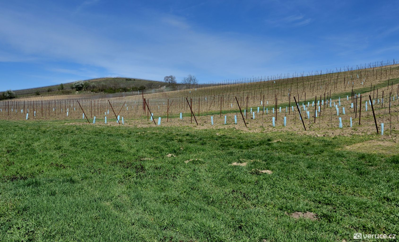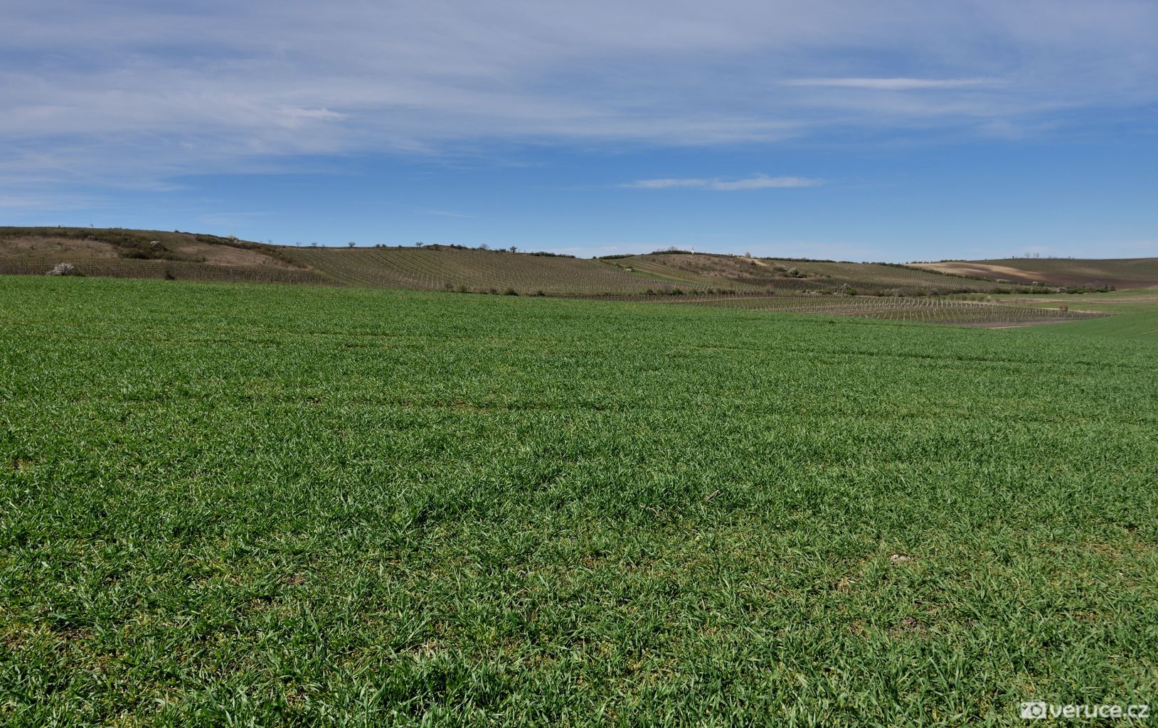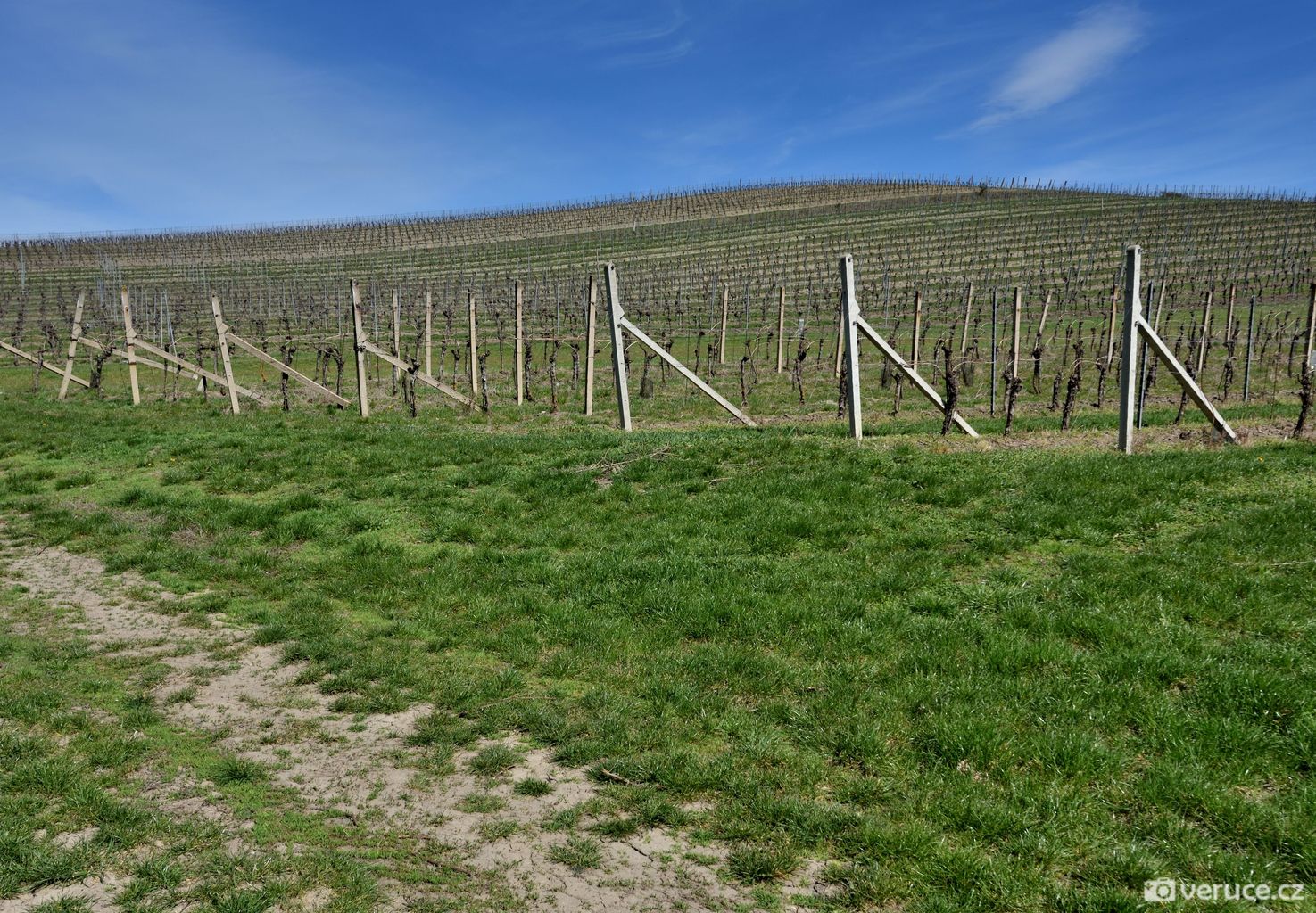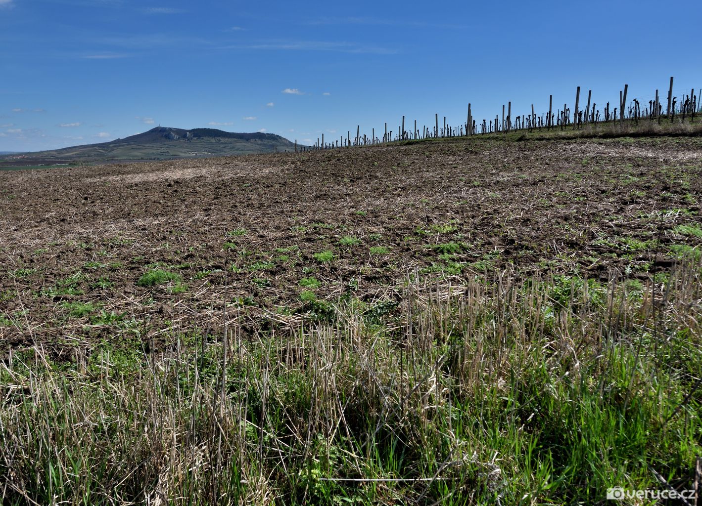 Jistě vás, stejně jako mě, zajímá, kde se mezi vinicemi v mírně zvlněné krajině vzal ten nápadný terasovitý kopec, k němuž jsme z Růžové hory následně zamířili. Rozluštění této záhady je poměrně snadné, protože se o žadnou záhadu nejedná. Velká Slunečná není žádná stupňovitá pyramida, byť ji trochu připomíná, ale obyčejný vrch, na němž byla v 60. letech minulého století provedena terasovitá úprava coby příprava pro budoucí vinici. Důvod k tomuto kroku byl prostý – prudké svahy se špatně obhospodařovávaly. Na zasetí vinné révy už ale nedošlo.