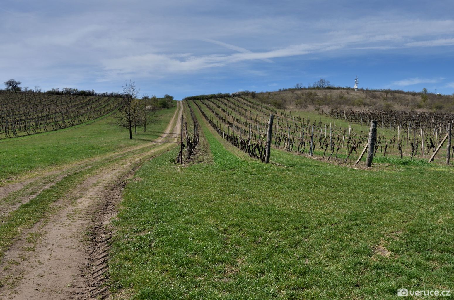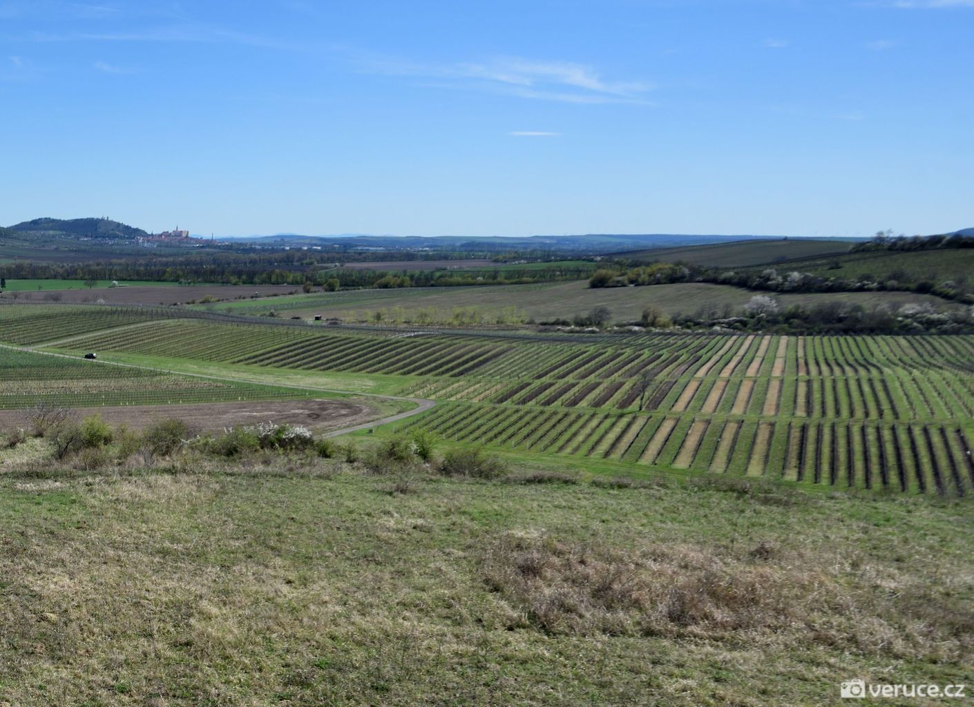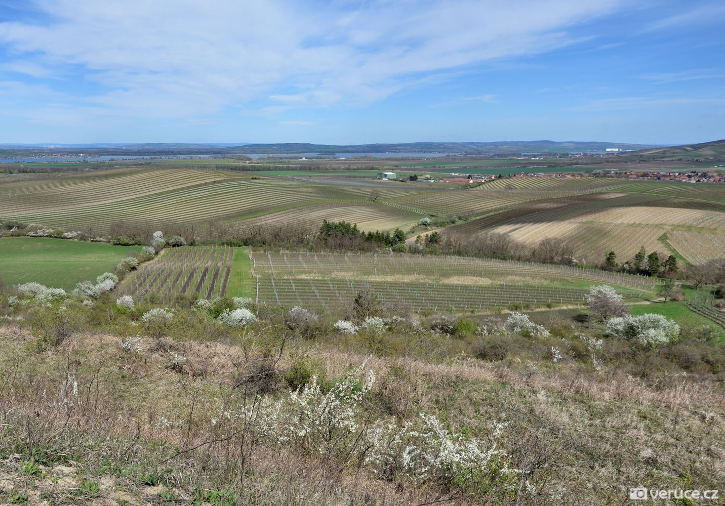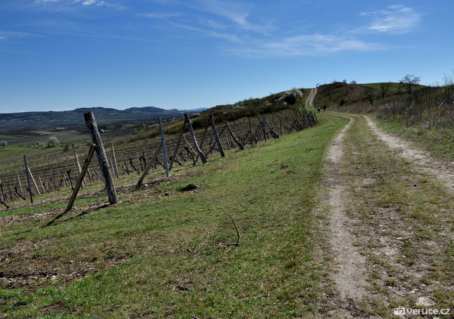 Od auta jsme vyrazili po zpevněné cestě, po zhruba 1,5 kilometru mezi vinicemi jsme zahnuli doleva a vydali se do kopce. Výhledy na Pálavu jsme si užili už cestou nahoru a později z celého hřebene Dunajovickcýh kopců. Dohlédnout se dá až na Mikulov a dál do Rakouska. Při dobré viditelnosti se na obzoru tyčí alpské vrcholy, které jsme toho dne spíše jen tušili, než doopravdy viděli (na slunci se místy odrážely zasněžené vrcholky). Severním směrem uvidíte vodní nádrž Nové Mlýny a tím západním kus jihomoravské krajiny.