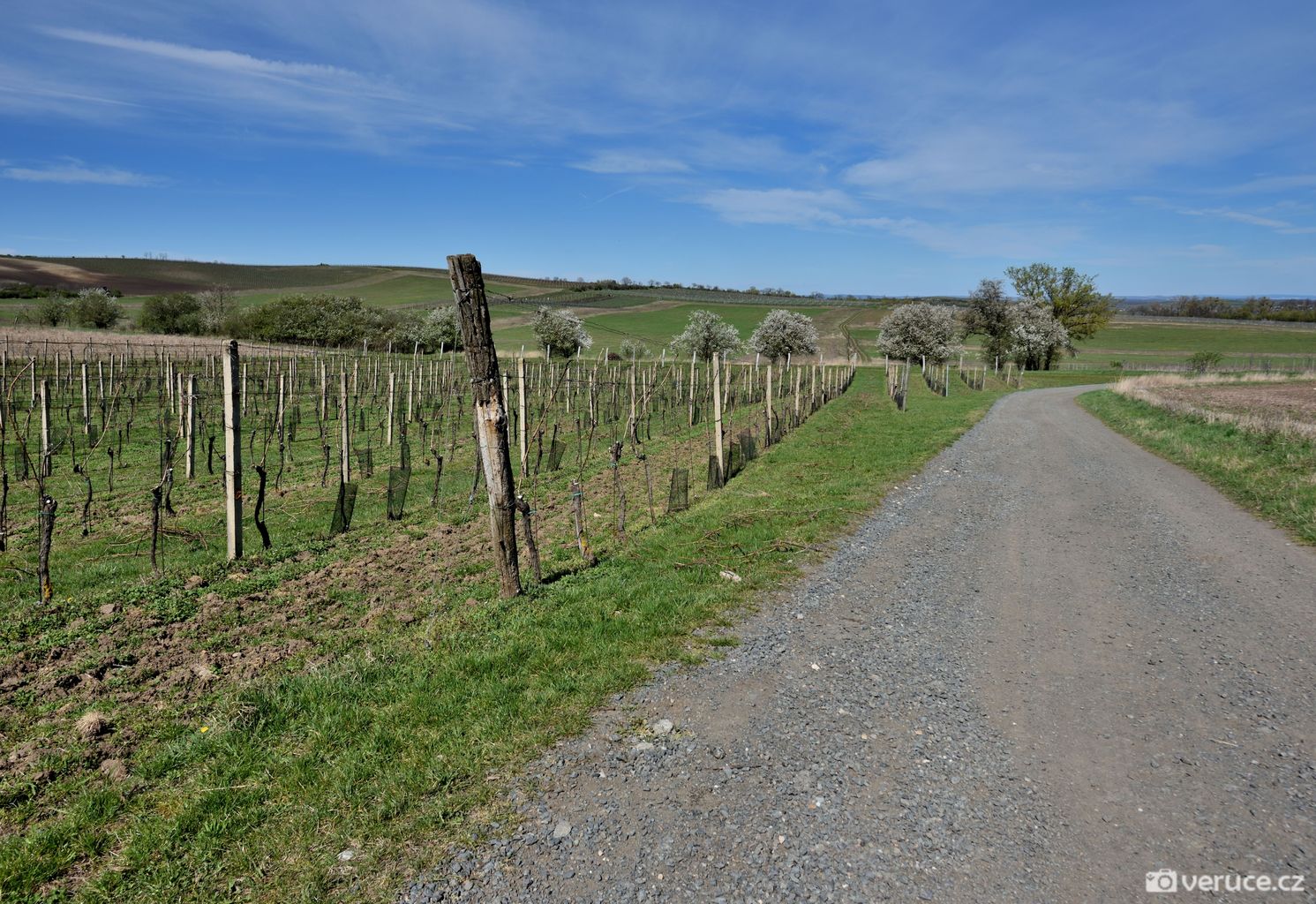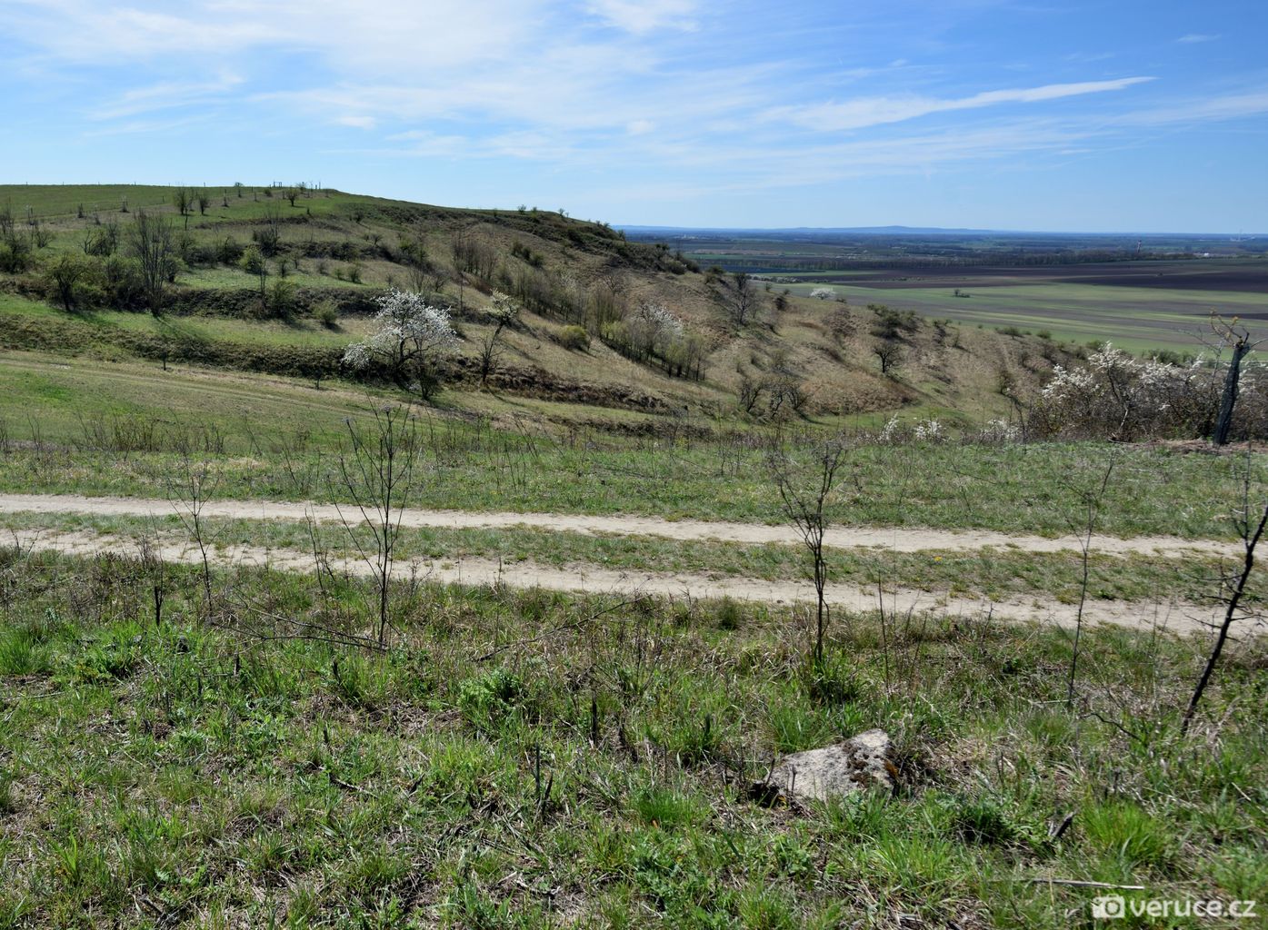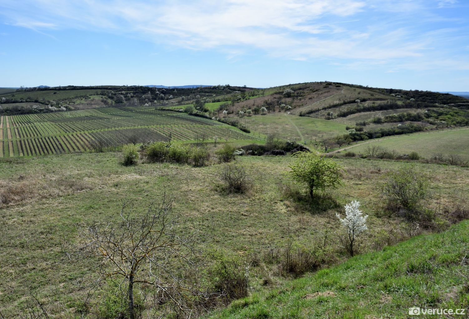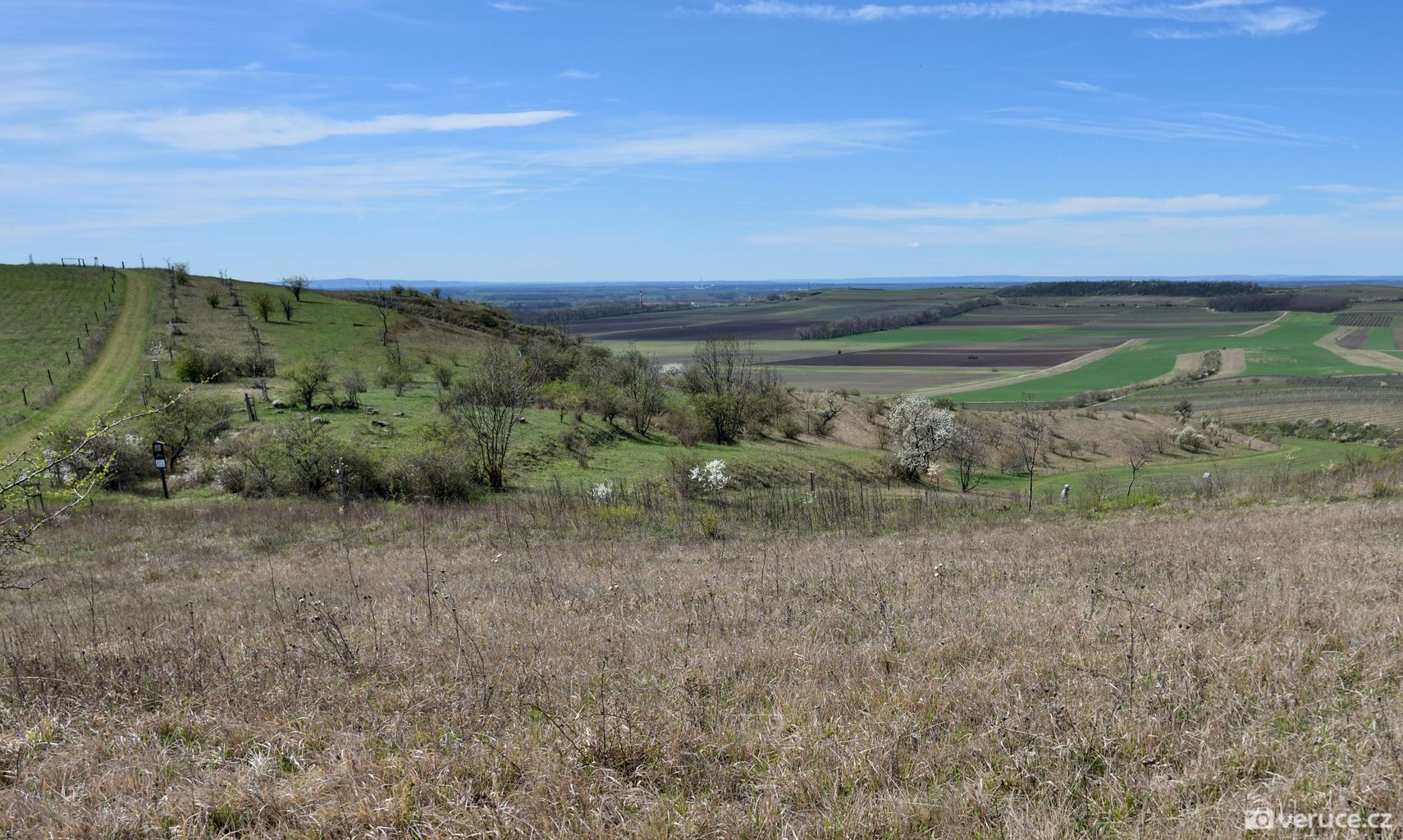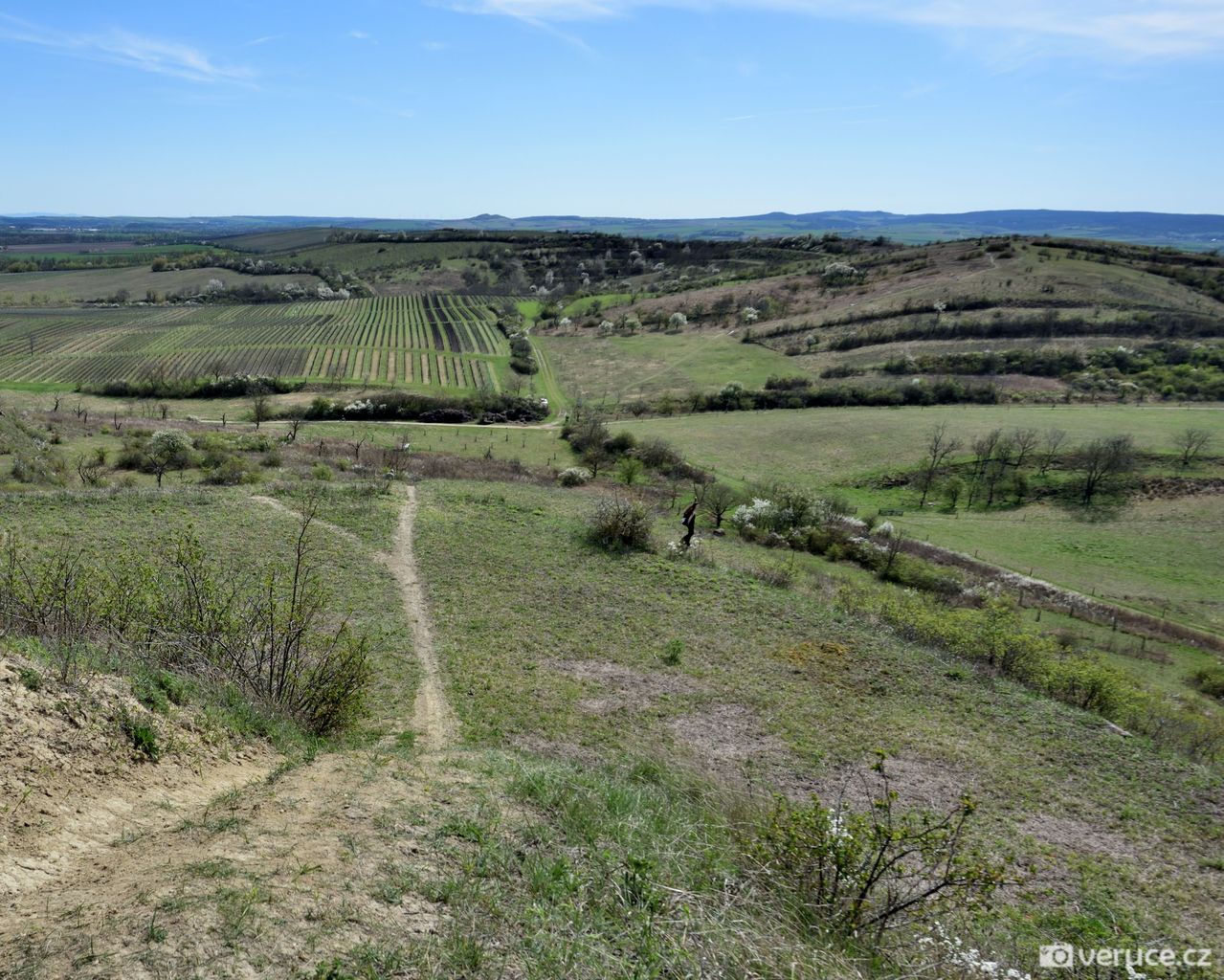 Od auta jsme vyrazili po zpevněné cestě, po zhruba 1,5 kilometru mezi vinicemi jsme zahnuli doleva a vydali se do kopce. Výhledy na Pálavu jsme si užili už cestou nahoru a později z celého hřebene Dunajovickcýh kopců. Dohlédnout se dá až na Mikulov a dál do Rakouska. Při dobré viditelnosti se na obzoru tyčí alpské vrcholy, které jsme toho dne spíše jen tušili, než doopravdy viděli (na slunci se místy odrážely zasněžené vrcholky). Severním směrem uvidíte vodní nádrž Nové Mlýny a tím západním kus jihomoravské krajiny.