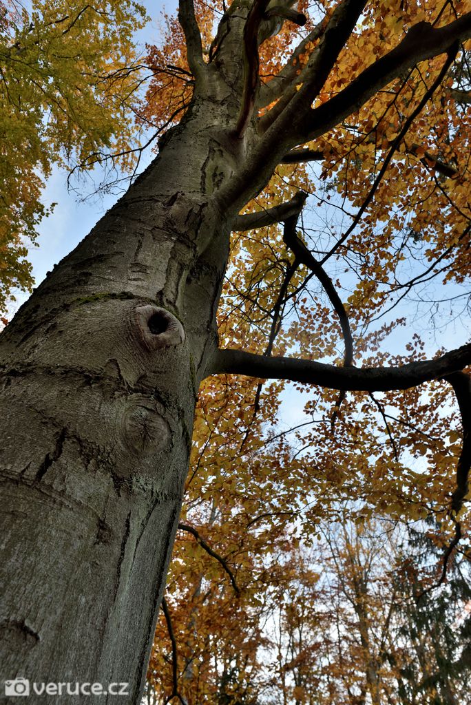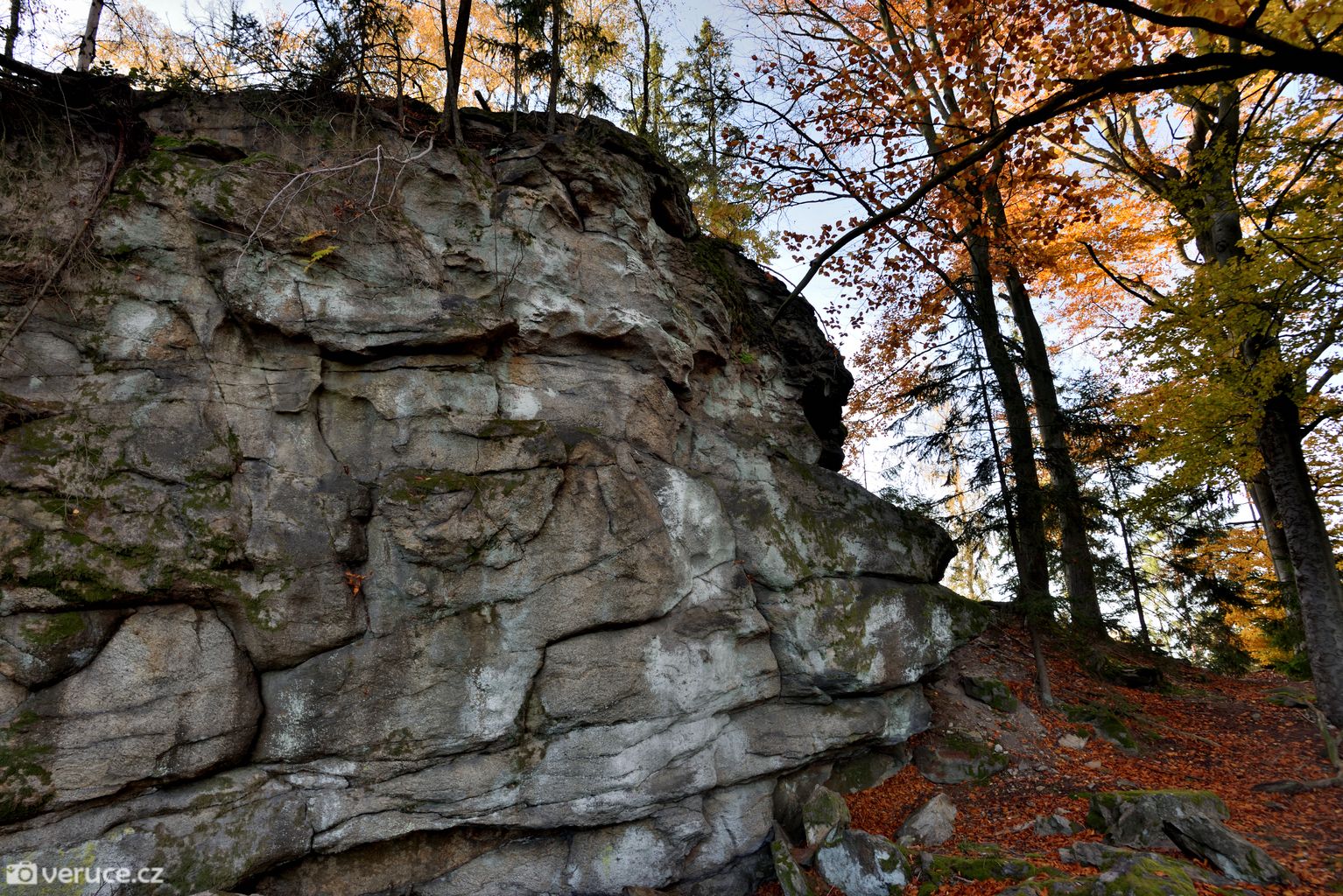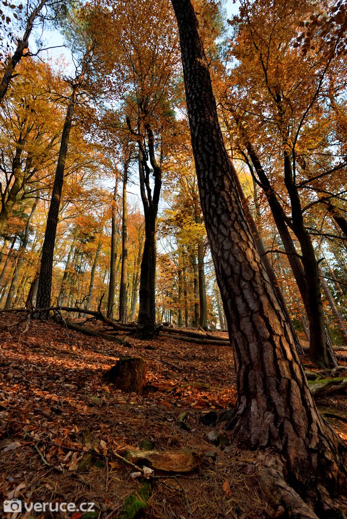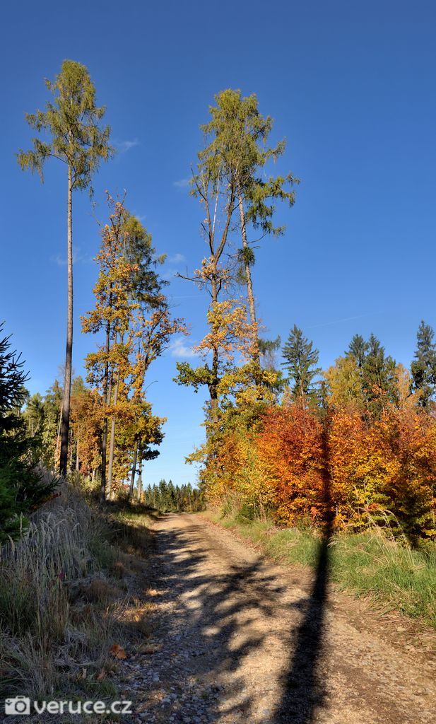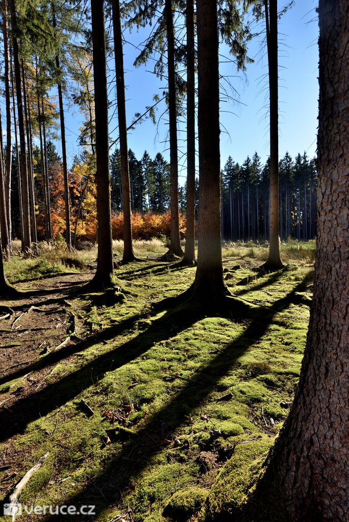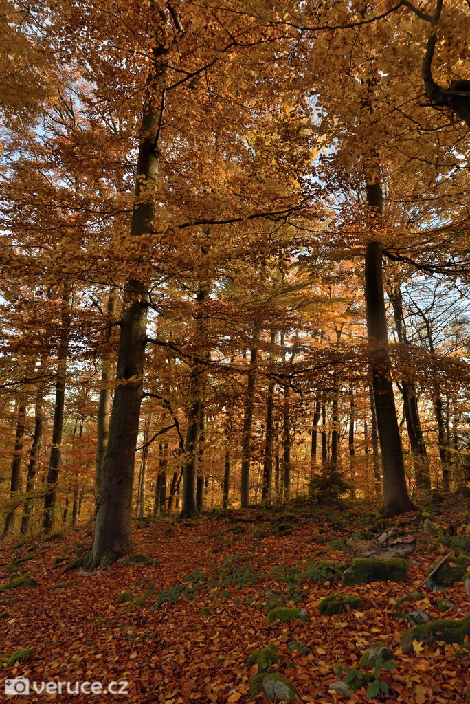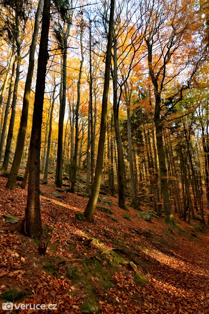 Vrátili jsme se na zelenou a vydali se kolem Veřejové skály zpět k centrálnímu parkovišti a pak po silnici k tomu našemu. Podzimní les ještě více hýřil barvami v zapadajícím slunci, skála se však už téměř topila ve tmě, takže si ji nechám na příště. Však jsme tady nebyli naposled.