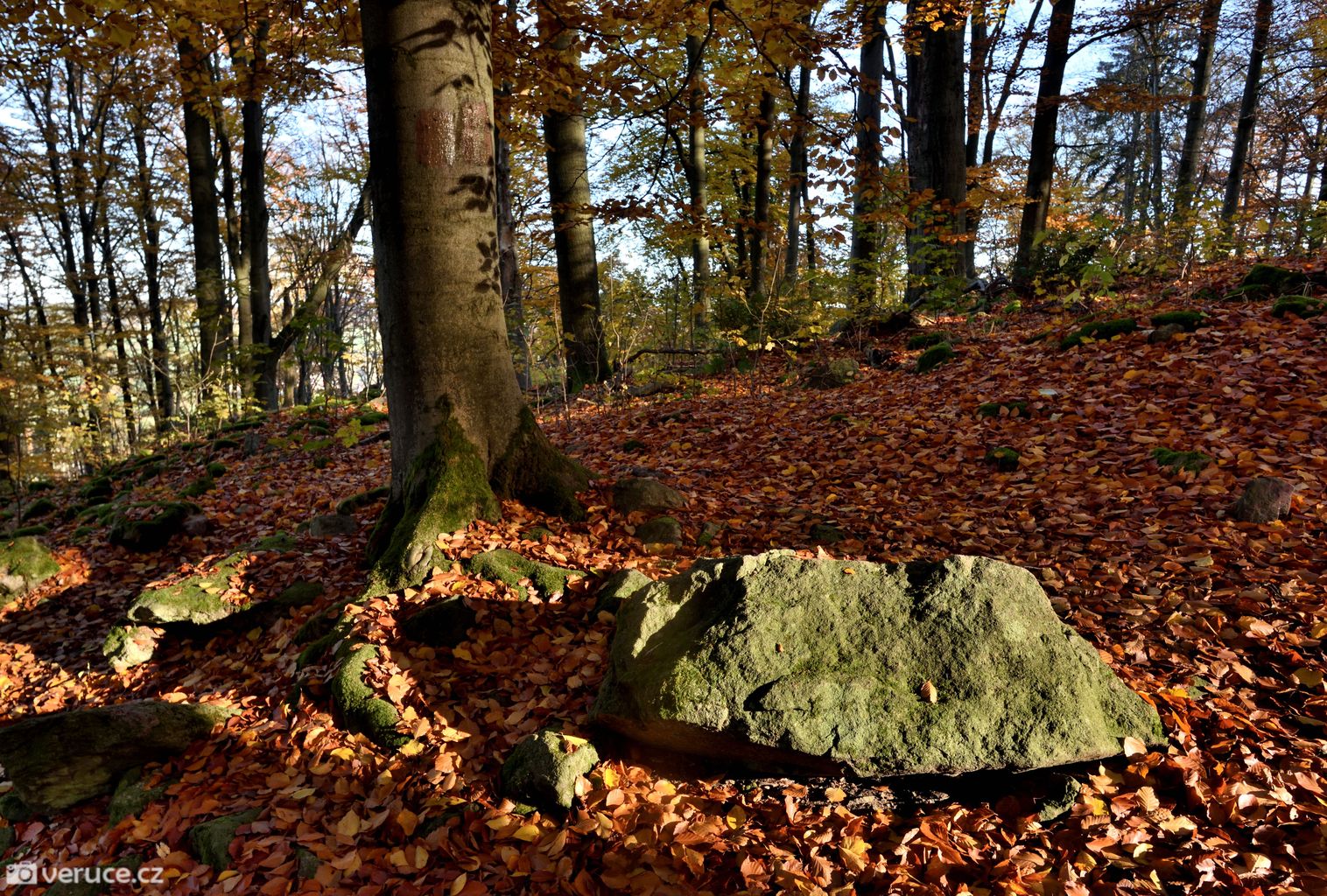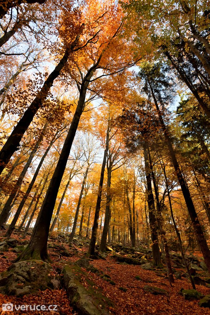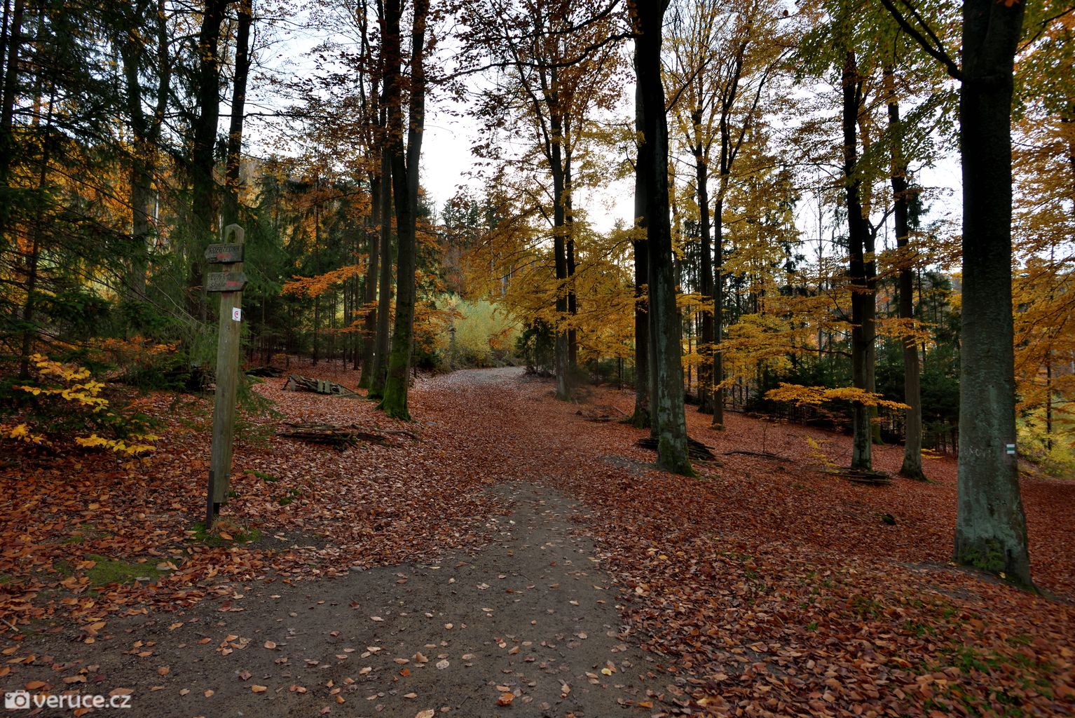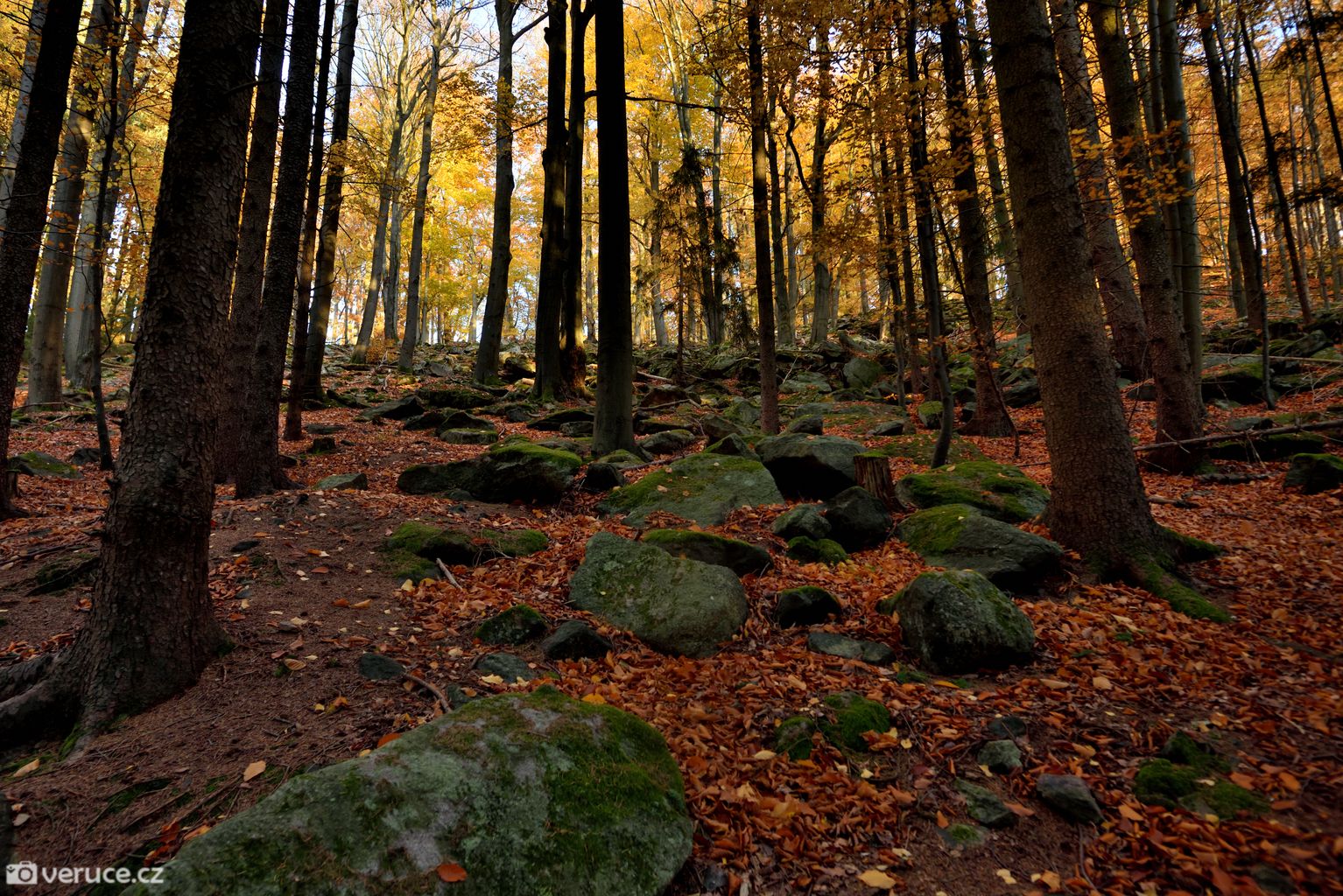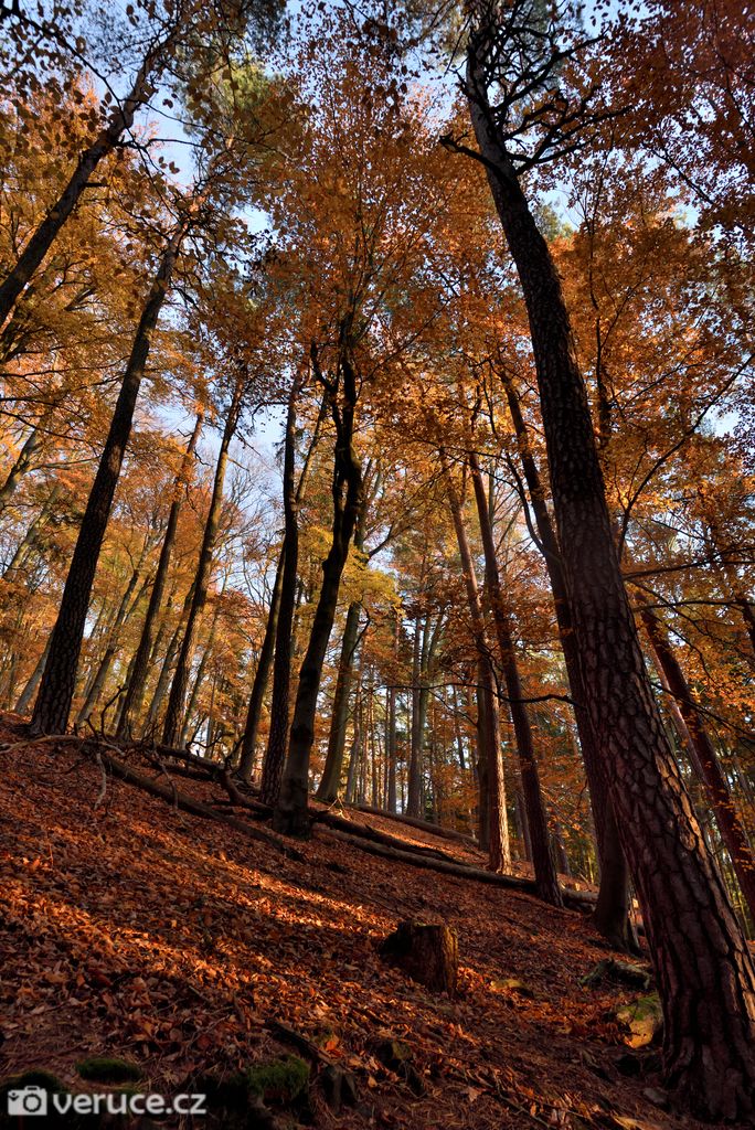 Vrátili jsme se na zelenou a vydali se kolem Veřejové skály zpět k centrálnímu parkovišti a pak po silnici k tomu našemu. Podzimní les ještě více hýřil barvami v zapadajícím slunci, skála se však už téměř topila ve tmě, takže si ji nechám na příště. Však jsme tady nebyli naposled.