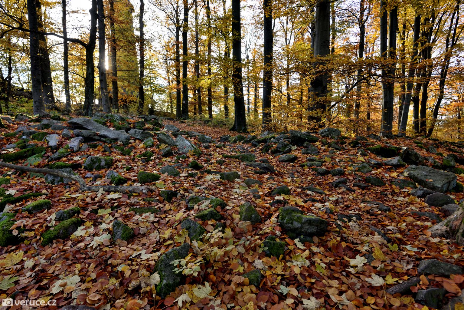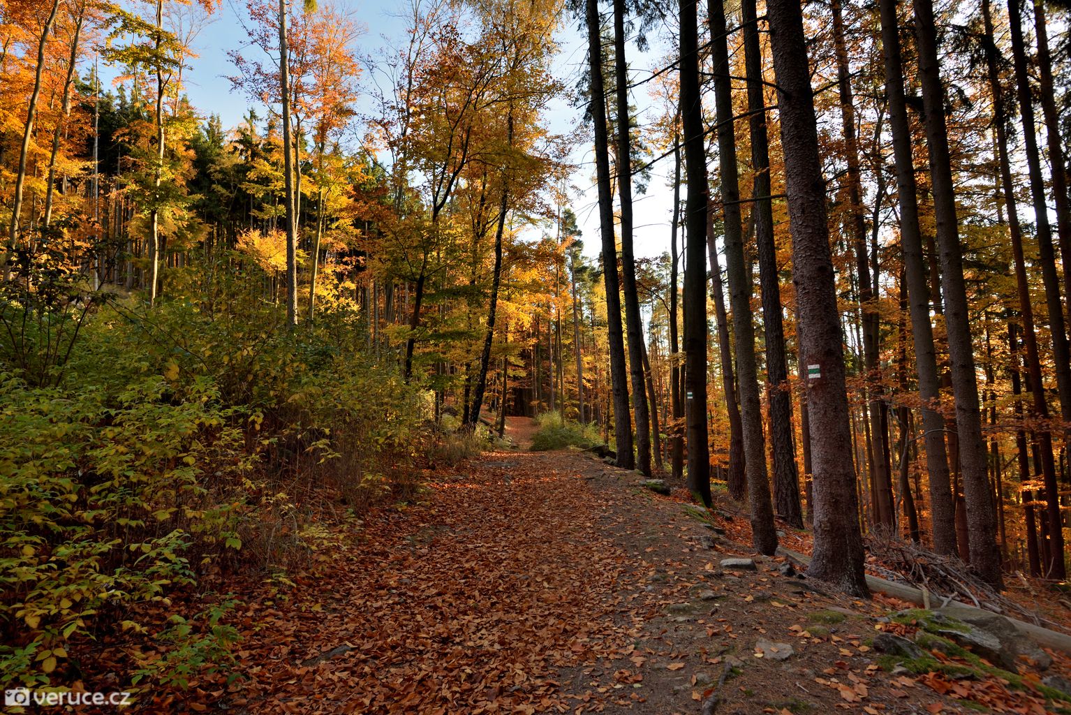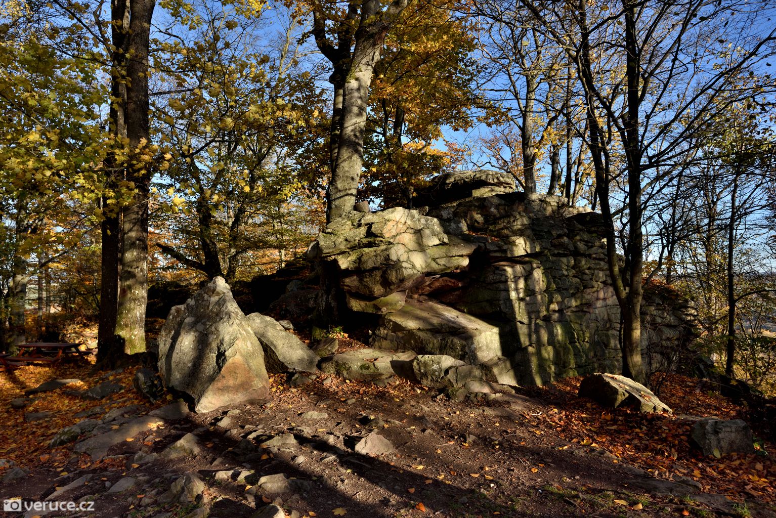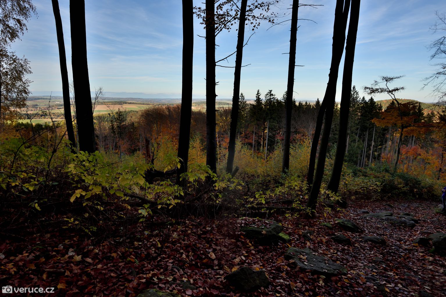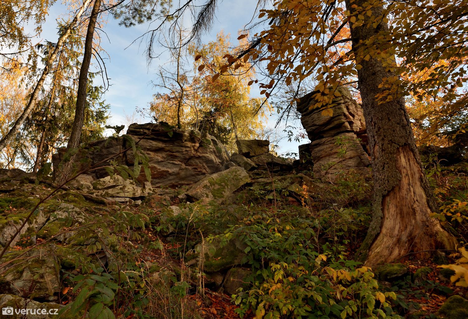 Vrátili jsme se na zelenou a vydali se kolem Veřejové skály zpět k centrálnímu parkovišti a pak po silnici k tomu našemu. Podzimní les ještě více hýřil barvami v zapadajícím slunci, skála se však už téměř topila ve tmě, takže si ji nechám na příště. Však jsme tady nebyli naposled.