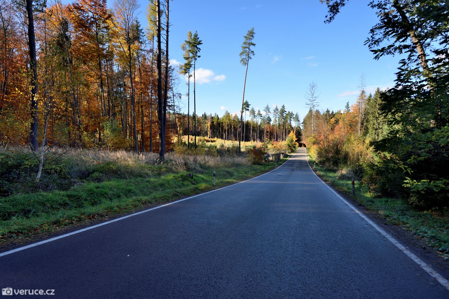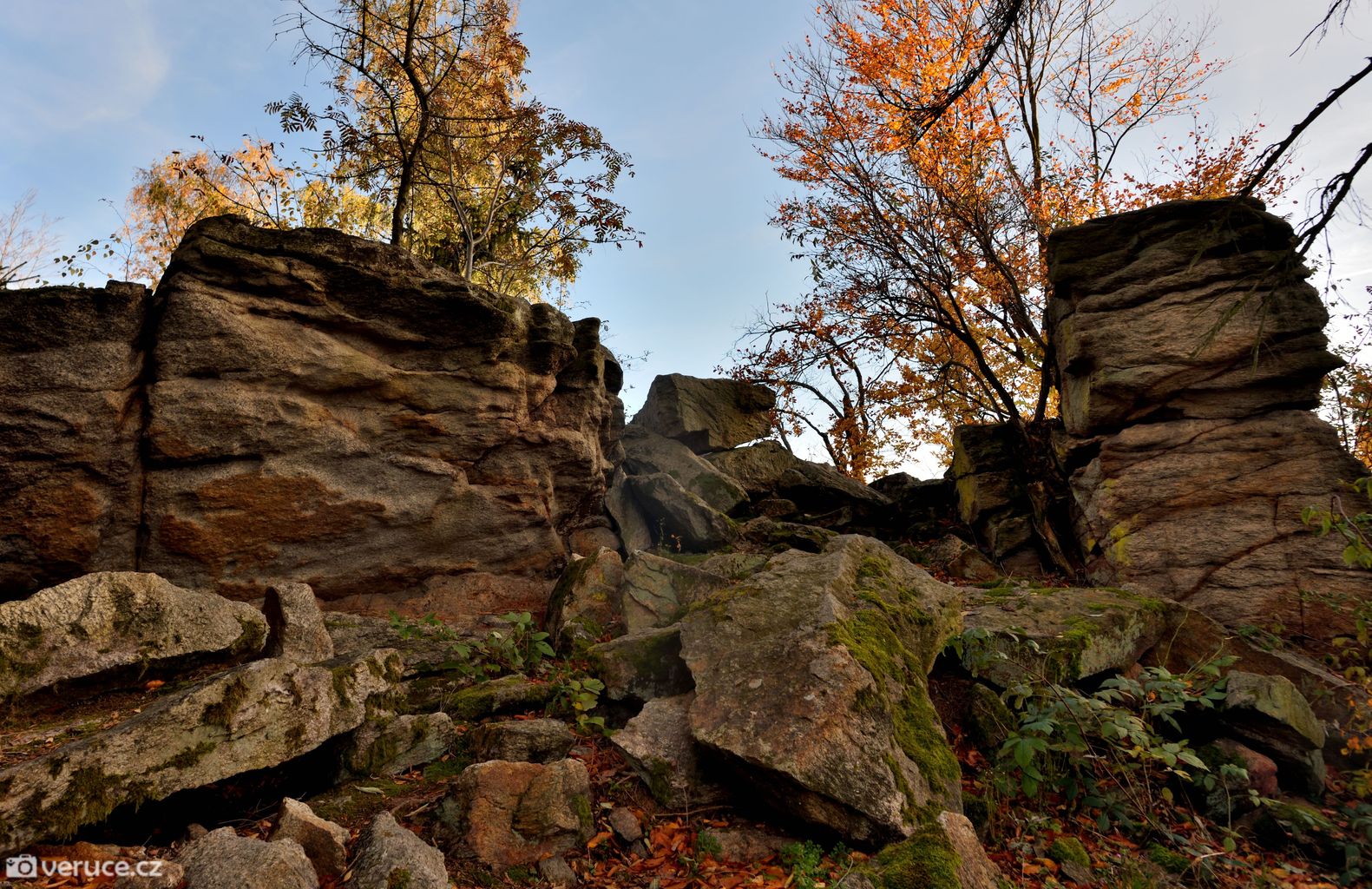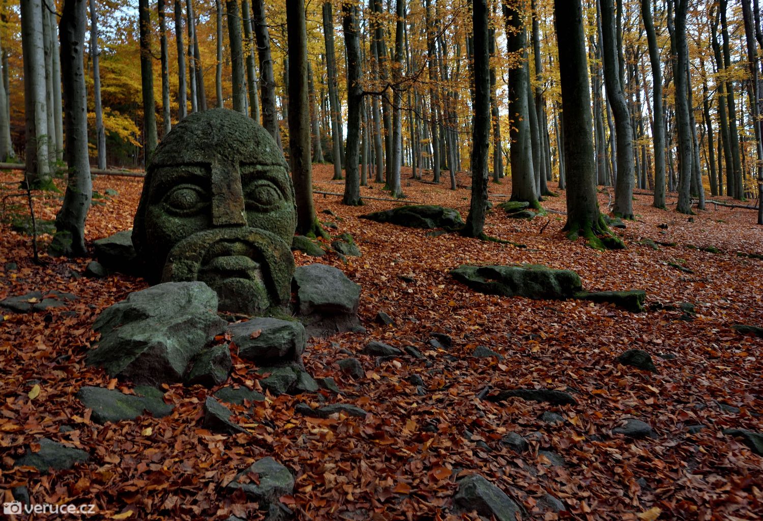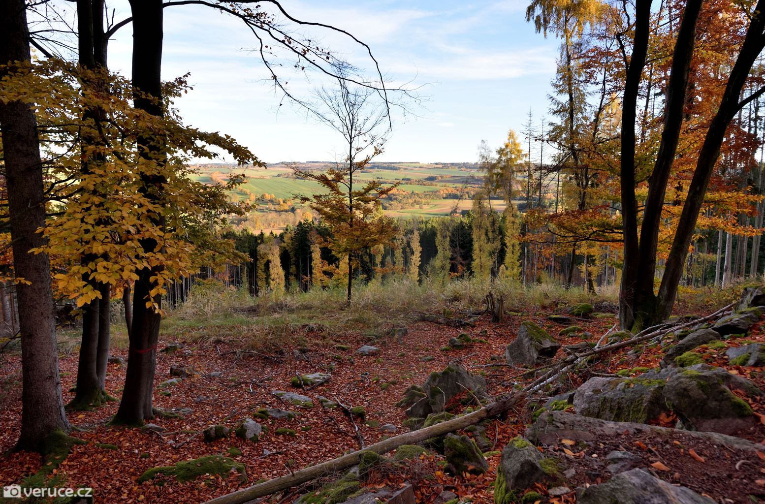 Vrátili jsme se na zelenou a vydali se kolem Veřejové skály zpět k centrálnímu parkovišti a pak po silnici k tomu našemu. Podzimní les ještě více hýřil barvami v zapadajícím slunci, skála se však už téměř topila ve tmě, takže si ji nechám na příště. Však jsme tady nebyli naposled.