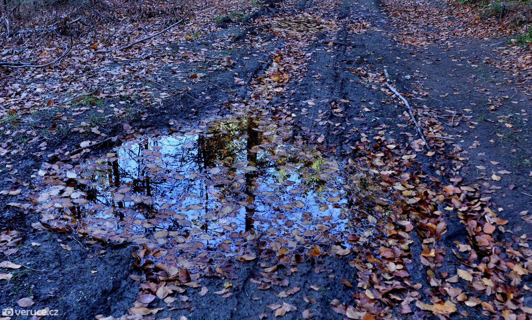 U pěšiny vedoucí nejkratší cestou jsme si všimli upozornění na podmáčený terén, takže jsme to vzali mírnou oklikou přes Lesáky, kde jsme se připojili na zelenou. Mokro bylo místy i tady, takže jsme tohoto rozhodnutí opravdu nelitovali.
