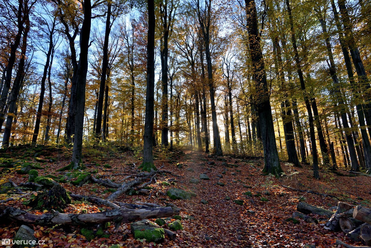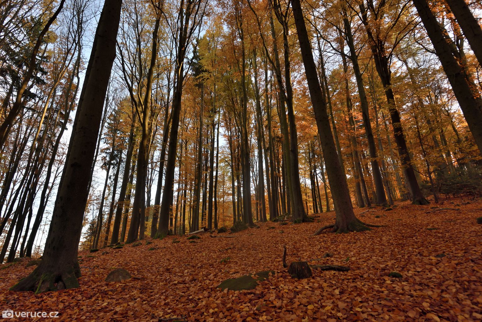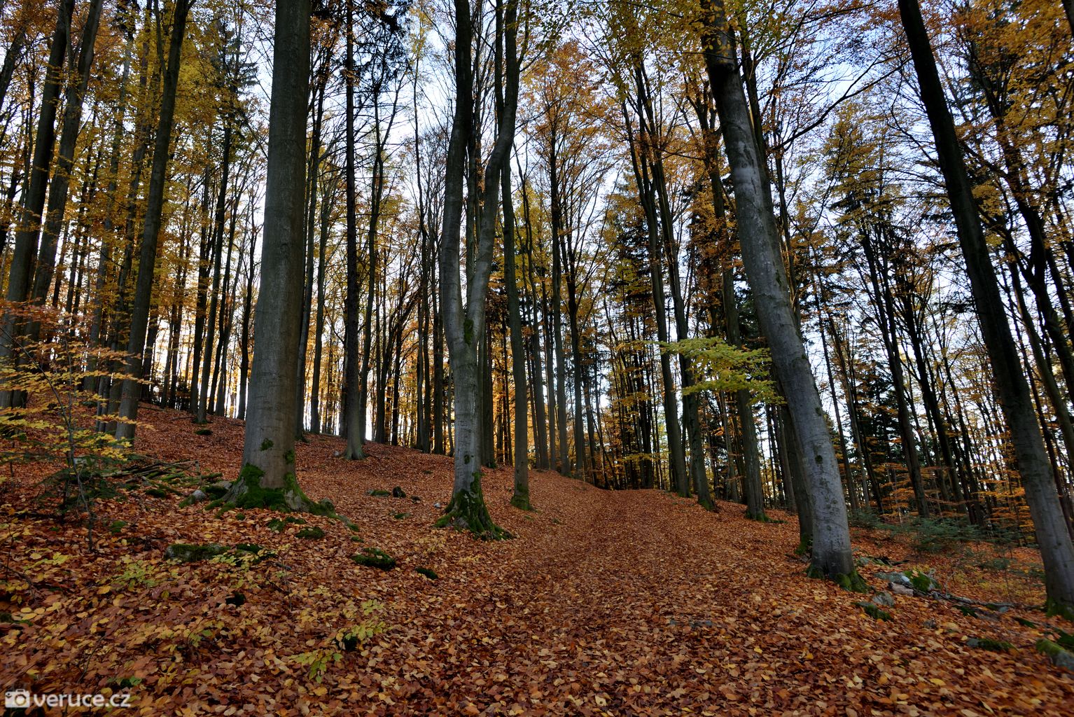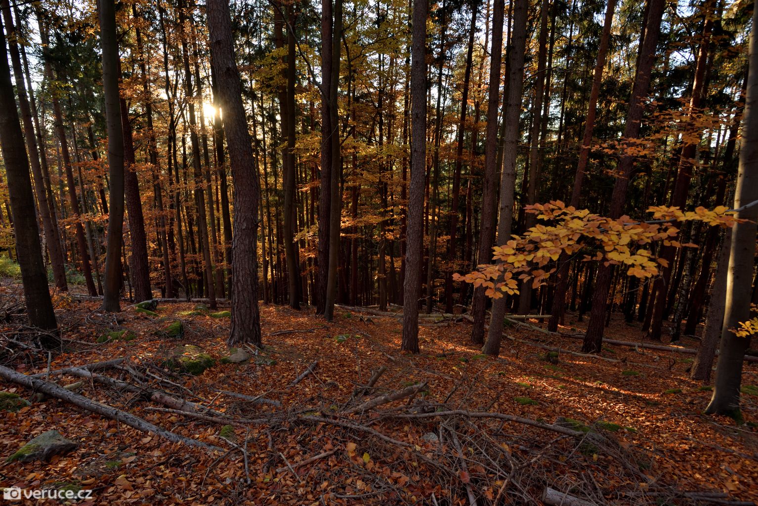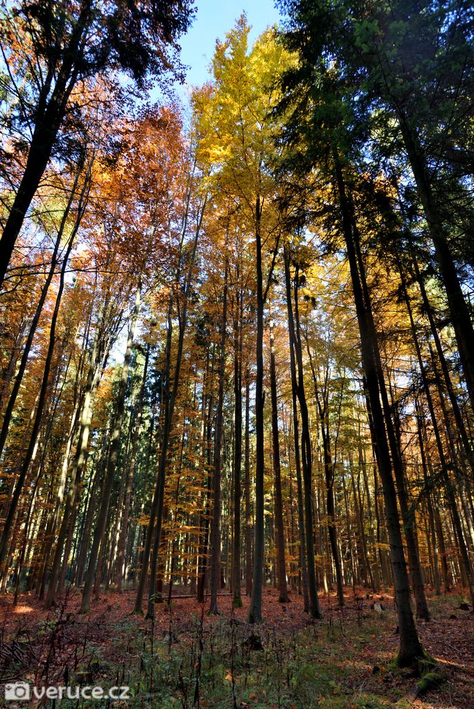 Podzimní les ten den hýřil barvami, a to až do západu slunce. Procházku jsme si opravdu užívali. S břichem a čerstvým miminkem jsme toho ten rok moc nenachodili. Procházky v okolí našeho bydliště nás spíš rozčilují (mezi poli se chodit nedá, trasy pro pěší chybí a po silnicích to není nic moc), větší výpady byly logisticky celkem náročné (případně bylo jednoduše ošklivo) a tohle byl vlastně větší výlet po několika měsících, kdy jsme předtím byli naposledy v létě na Jizeře.